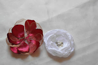 Beus küldött képet a leendő laza kontyáról, amibe külön csatokkal ellátott virágokat kért. Melírozott hajához külön, színben passzoló hullámcsatot vettem, erre kerültek a bazsarózsára emlékeztető virágok, egy kisebb és egy nagyobb. ( a méretbeli különbség végül alig észrevehetőre csökkent, mire a sok-sok sziromból felépültek a virágok.... De nem volt szívem elvenni a szirmok számából, valahogy így volt teljes az én szememben a "kicsi" is:)